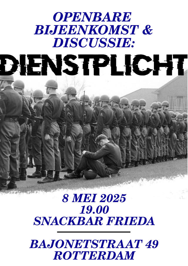 Op donderdag 8 mei komen we samen in Snackbar Frieda om te praten over de dienstplicht. De verplichte deelname in het leger is in Nederland al sinds 1997 gedeactiveerd, maar nooit afgeschaft. Iedereen – sinds 2020 niet enkel maar mannen – krijgt op zijn 17e levensjaar een oproepbrief voor de militaire dienst met daarbij de melding dat de oproep nu niet actief is. Een eerste stap in de richting van heractivering is onlangs genomen, door nu een enquête over toetreding tot het leger bij de oproep brief te voegen.