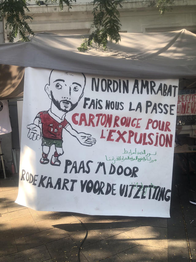 Op het plein sturen de bewoners van de Zone Neutre hem een boodschap: “Nordin Amrabat, paas ‘m door naar ons, rode kaart voor de uitzetting”.