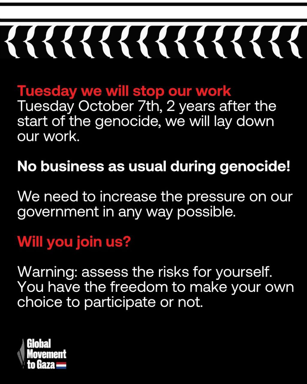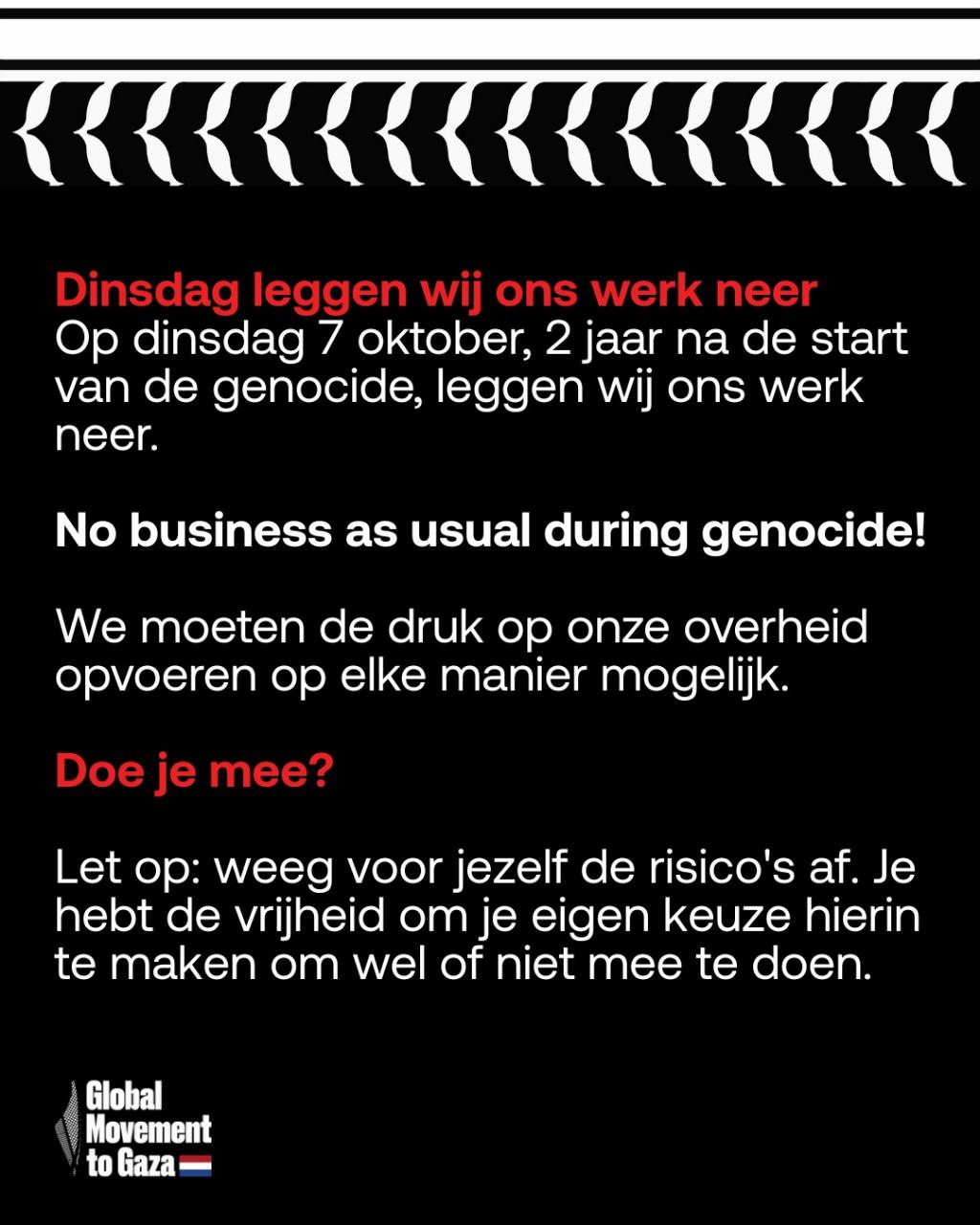 Dinsdag 7 Okt: STRIKE! STAAK! #NoBusinessAsUsual during genocide! #GMTGNL #FreePalestine !