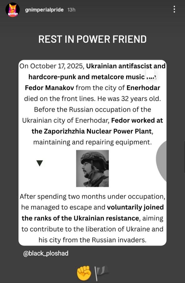 on October 17 2025 Ukrainian antifascist and hard-core punk and metal-core miusic ... Fedor Manakov from the city of Enerhodar died on the front line.