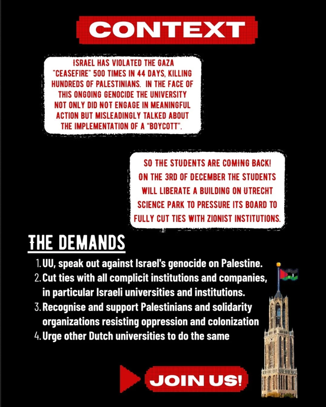 ????To take action against this, we will be liberating one of UU’s buildings from its complicit owners, and turning it into a space where discussion and action for Palestine can flourish.